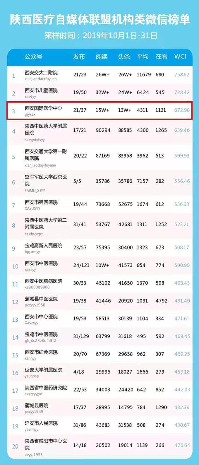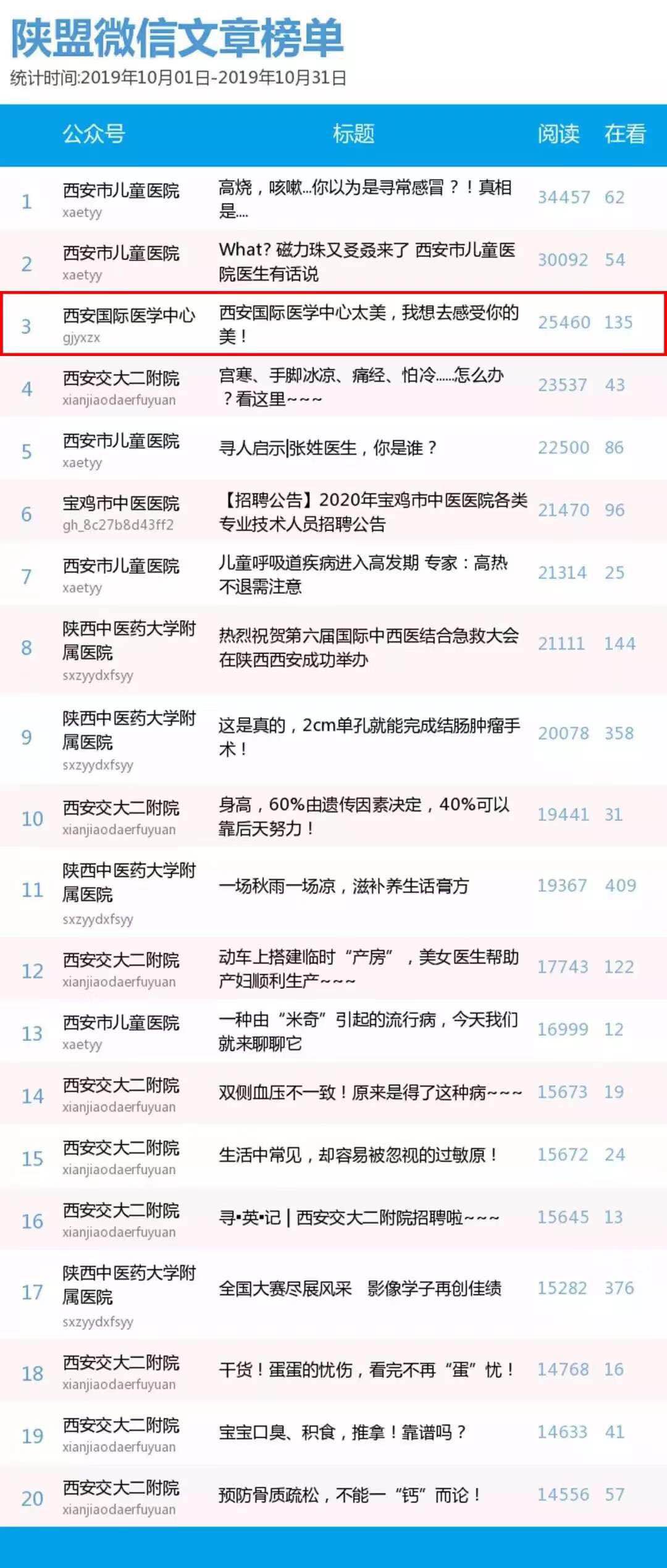 11月4日,陜西醫(yī)療自媒體聯(lián)盟醫(yī)療機(jī)構(gòu)類微信公眾號(hào)2019年10月排行榜出爐,西安國(guó)際醫(yī)學(xué)中心微信公眾號(hào)穩(wěn)扎穩(wěn)打,繼續(xù)占據(jù)陜盟微信文章榜單及醫(yī)療機(jī)構(gòu)類榜單三甲位置。