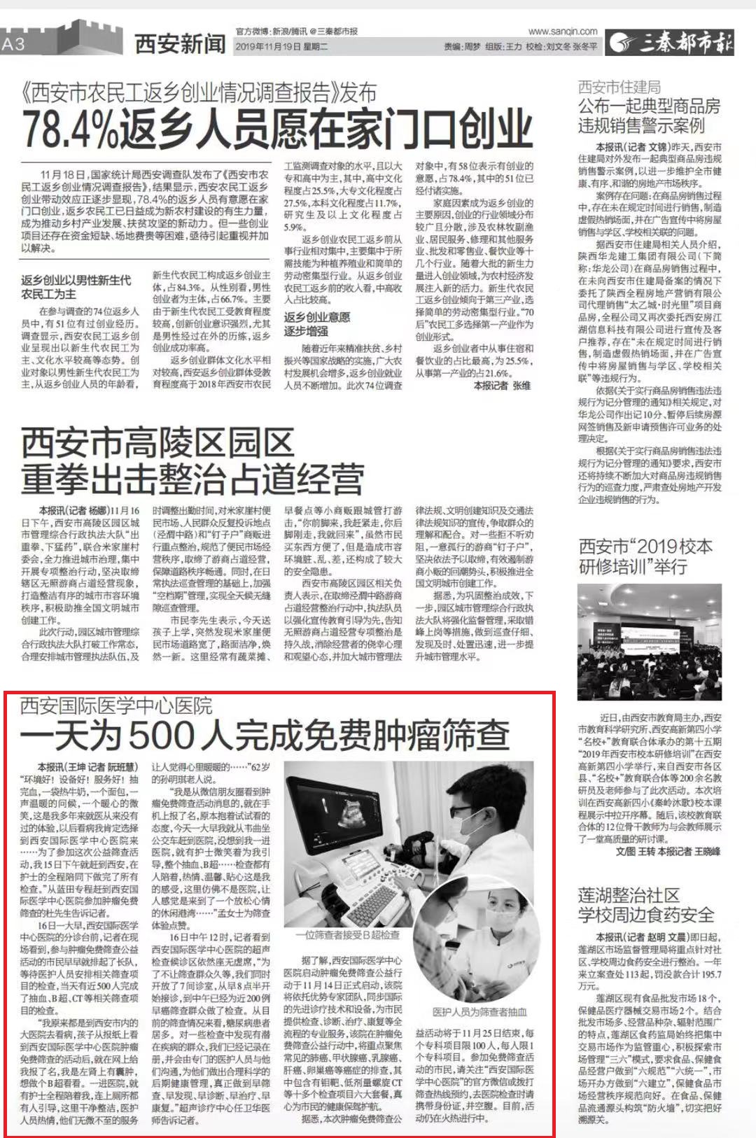三秦都市報報道—西安國際醫(yī)學中心醫(yī)院一天為500人完成免費腫瘤篩查。點擊閱讀。