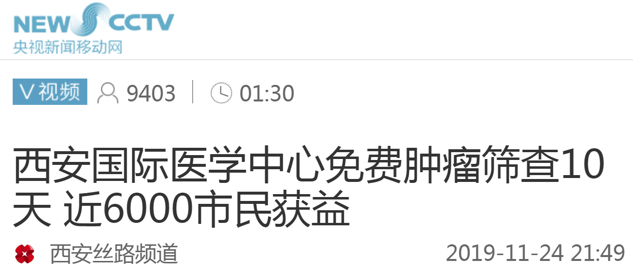 央視新聞移動網(wǎng)報道—西安國際醫(yī)學中心免費腫瘤篩查10天 近6000市民獲益。點擊閱讀。