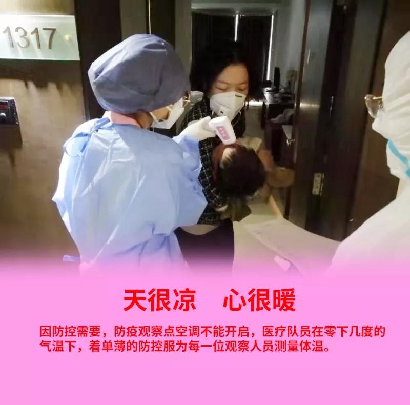 這支醫(yī)療隊(duì)由3名醫(yī)生、5名護(hù)士組成,分別是房武寧、張曉敏、王婧3位醫(yī)生;護(hù)士為白容容、陳蕓、王亞馨、燕瑞娥、田橋。身穿不透氣的防護(hù)服,醫(yī)護(hù)人員時(shí)時(shí)刻刻與時(shí)間拼耐心、與疫情變化拼細(xì)心。留觀人員中有16名70歲以上的老人,6名3歲以下的兒童。他們體質(zhì)較弱,需要更多的關(guān)懷與呵護(hù)。護(hù)士王亞馨每天要在樓上往返7、8趟為他們測(cè)體溫、安撫情緒。“我也時(shí)常想念家人,春節(jié)沒法和他們一起過(guò)年?,F(xiàn)在,這里的老人和孩子就是我的家人?!闭f(shuō)著,豆大的汗珠順著她的眼睫毛滑落。即便超負(fù)荷工作著,她也從未喊過(guò)苦叫過(guò)累。