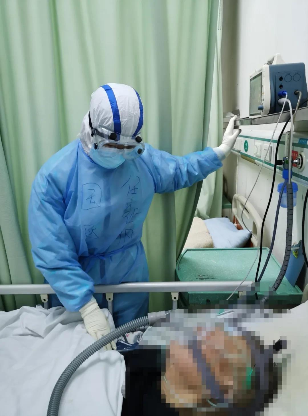 凌晨1點(diǎn)多,一位84歲的老人,確診為陽性,無尿,四肢冰冷,使用呼吸機(jī)。我們迅速補(bǔ)液,并用手套自制的暖水袋給予保暖,同時(shí)不停地喊著:“爺爺,爺爺,不能放棄,加油,我們陪在你的身邊,一起和病毒做斗爭(zhēng)!”他好像能聽得見我們說話,微微地動(dòng)了一下頭,眼角濕潤(rùn)了。