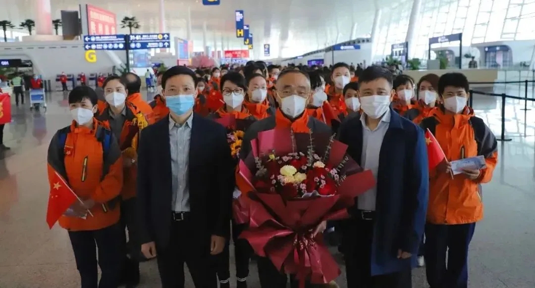 在熱烈的掌聲中,援漢醫(yī)療隊隊員們手捧鮮花,在武漢市民的感激聲中,登上機場大巴,啟程返回西安。