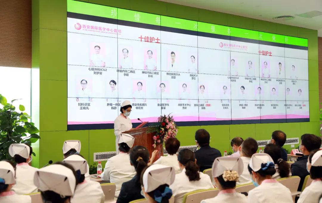 為紀(jì)念“5.12”國(guó)際護(hù)士節(jié),弘揚(yáng)南丁格爾精神,展示護(hù)理團(tuán)隊(duì)良好精神風(fēng)貌和職業(yè)風(fēng)范,5月9日,西安國(guó)際醫(yī)學(xué)中心醫(yī)院舉行新護(hù)士授帽儀式暨“十佳護(hù)士”表彰大會(huì),各科室分會(huì)場(chǎng)同時(shí)轉(zhuǎn)播。西安國(guó)際醫(yī)學(xué)中心醫(yī)院院長(zhǎng)尹強(qiáng)、副院長(zhǎng)李武平及各專科醫(yī)院、各科室、各職能部門共計(jì)千余人參加。大會(huì)由護(hù)理部主任張敏主持。