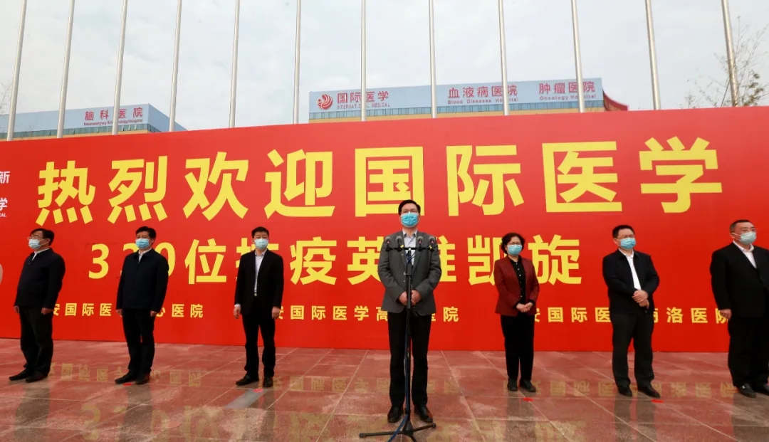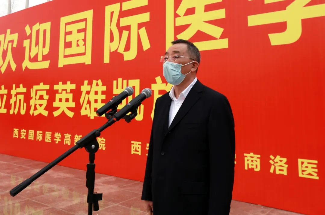 “歡迎回家!”在西安國(guó)際醫(yī)學(xué)中心的萬(wàn)人廣場(chǎng),陜西省副省長(zhǎng)趙剛,國(guó)務(wù)院應(yīng)對(duì)新冠肺炎疫情聯(lián)防聯(lián)控機(jī)制綜合組第十二工作指導(dǎo)組組長(zhǎng)、國(guó)家衛(wèi)健委人才中心主任、黨委書(shū)記張俊華,省衛(wèi)健委書(shū)記劉勤社,省衛(wèi)健委主任劉寶琴,省衛(wèi)健委副主任、省保健局局長(zhǎng)趙嵐,省衛(wèi)健委副主任劉嶺,西安市委常委、高新技術(shù)開(kāi)發(fā)區(qū)黨工委書(shū)記、西安民用航天產(chǎn)業(yè)基地黨工委書(shū)記鐘洪江,國(guó)際醫(yī)學(xué)董事長(zhǎng)史今、總裁劉瑞軒、副總裁孫文國(guó)、西安國(guó)際醫(yī)學(xué)中心醫(yī)院院長(zhǎng)尹強(qiáng)等出席歡迎儀式,向醫(yī)療隊(duì)表示親切的問(wèn)候,并向他們無(wú)畏生死、奮戰(zhàn)一線的精神致敬!