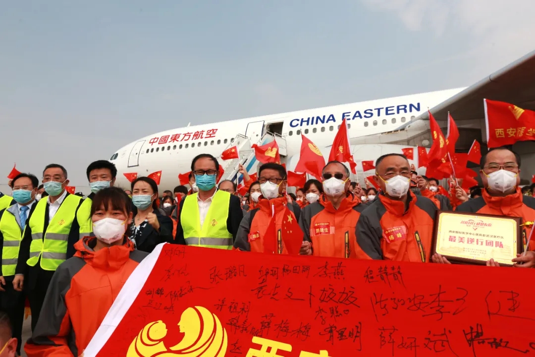 不負(fù)韶華戰(zhàn)疫情,春滿華夏迎君歸。西安國(guó)際醫(yī)學(xué)中心醫(yī)院支援湖北醫(yī)療隊(duì)225名醫(yī)護(hù)人員圓滿完成救援任務(wù),由“凱旋門(mén)”登機(jī),搭乘“勝利號(hào)”,于3月24日抵達(dá)西安。西安國(guó)際醫(yī)學(xué)中心醫(yī)院還有張欣、李晶、申歡歡、張波、馬喬璐、商江麗等6名隊(duì)員仍?shī)^戰(zhàn)在武漢協(xié)和醫(yī)院西院。