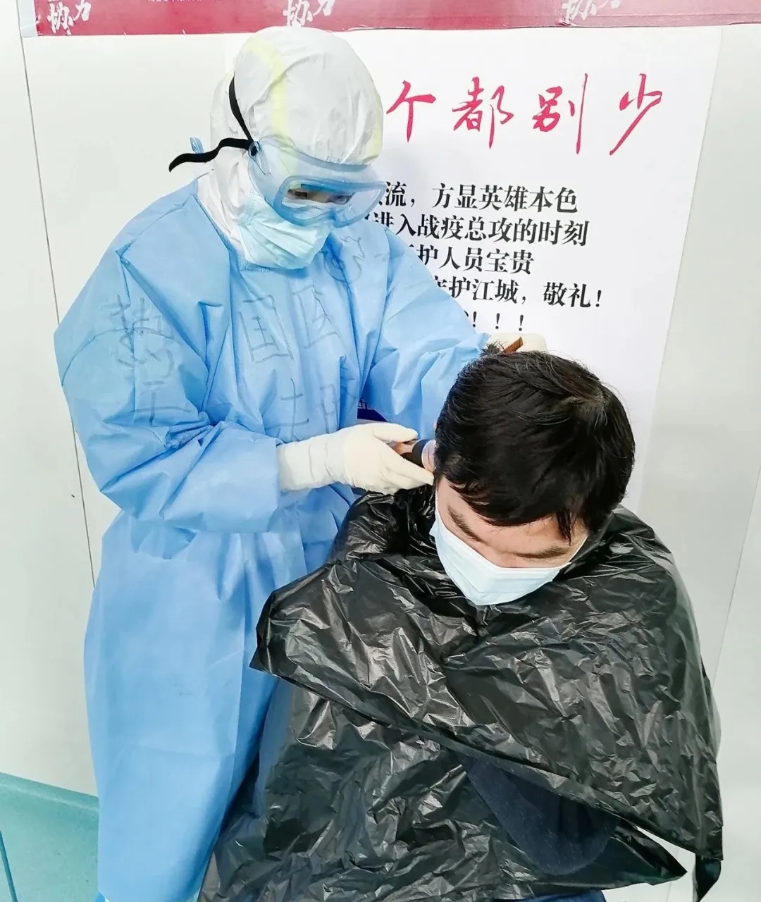 1艙有康復(fù)人員想理發(fā),手頭沒有工具,朱晴護(hù)士長得知后,聯(lián)系下個班次護(hù)士帶來推子,給大家理發(fā)。“看你動作很嫻熟啊,以前練過的吧”,“圍觀群眾”打趣道?!艾F(xiàn)學(xué)現(xiàn)賣,大家要求不要太高,有壓力??!”朱晴說。一直推到推子沒電,朱晴給6位康復(fù)人員簡單修剪了頭發(fā)。得知朱晴是西安醫(yī)療隊的護(hù)士,大家都親切的稱她“肉夾饃”!
