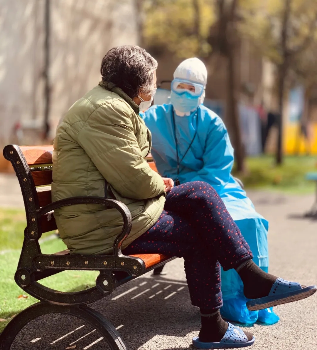 8艙有一位80多歲的老奶奶,中午出來遛彎時看到了醫(yī)療隊護(hù)士萬珍妮,主動過來攀談?!澳闶顷兾鱽淼模课铱茨阋路蠈懼靼矌讉€字了?!薄笆前?,奶奶,我們是西安國際醫(yī)學(xué)中心醫(yī)院來武漢支援的?!比f珍妮通過和奶奶聊天得知,奶奶的父親以前在寶雞工作過很長時間?!拔乙菜惆雮€陜西人了。沒想到在這里還能見到“老鄉(xiāng)”!感謝你們!”奶奶感覺很親切,和萬珍妮話起了“家常”。