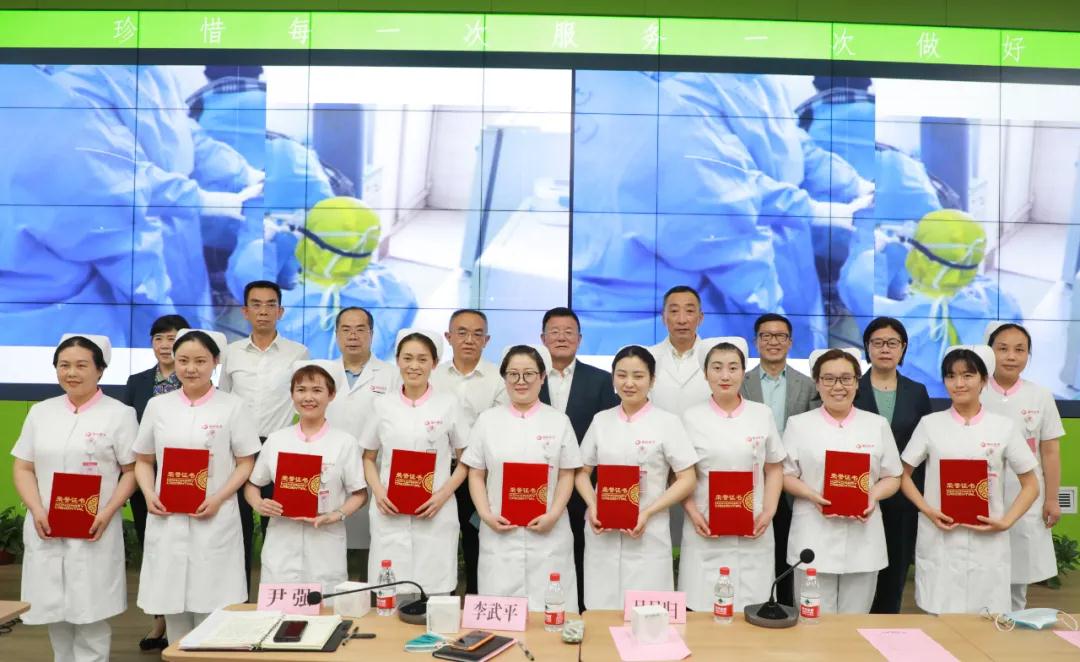 醫(yī)院領(lǐng)導(dǎo)為9名護(hù)理人員頒發(fā)了榮譽(yù)證書,并勉勵大家在今后的工作中,以嚴(yán)謹(jǐn)?shù)墓ぷ鲬B(tài)度、精湛的護(hù)理技術(shù)以及飽滿的精神和昂揚(yáng)的斗志,為廣大患者的生命健康保駕護(hù)航。