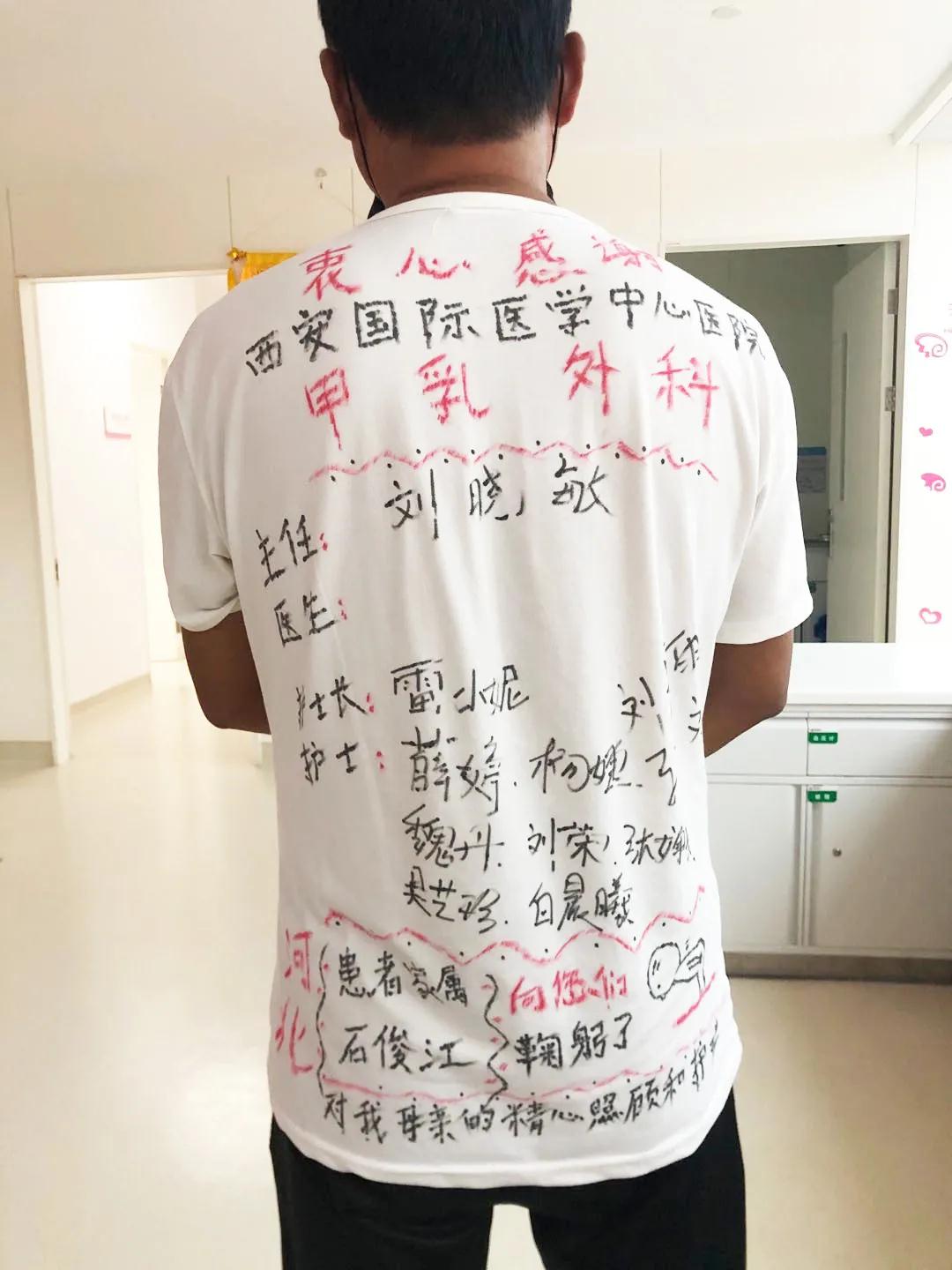 出院前一天,患者家屬想用一種特殊的方式記住醫(yī)生的恩情:“很感謝你們對我母親的照顧,你們在我這件襯衫上簽名,我開車拉貨的時候就穿這件衣服,我走到哪里就念著你們到哪里,宣傳到哪里!我想讓更多人知道西安國際醫(yī)學中心這家醫(yī)院!這家醫(yī)院不僅就醫(yī)環(huán)境好,醫(yī)護人員的服務(wù)態(tài)度也很棒,我在這里就醫(yī),讓我感覺到前所未有的溫暖,我想讓那些同樣飽受病痛折磨的人早日得到身心解放,他們也能感受到溫暖。”
