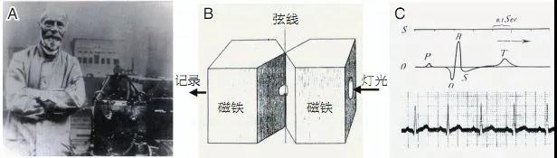 A:Einthoven;B:弦線式心電圖機模式圖;C:首例弦線式心電圖機記錄的心電圖