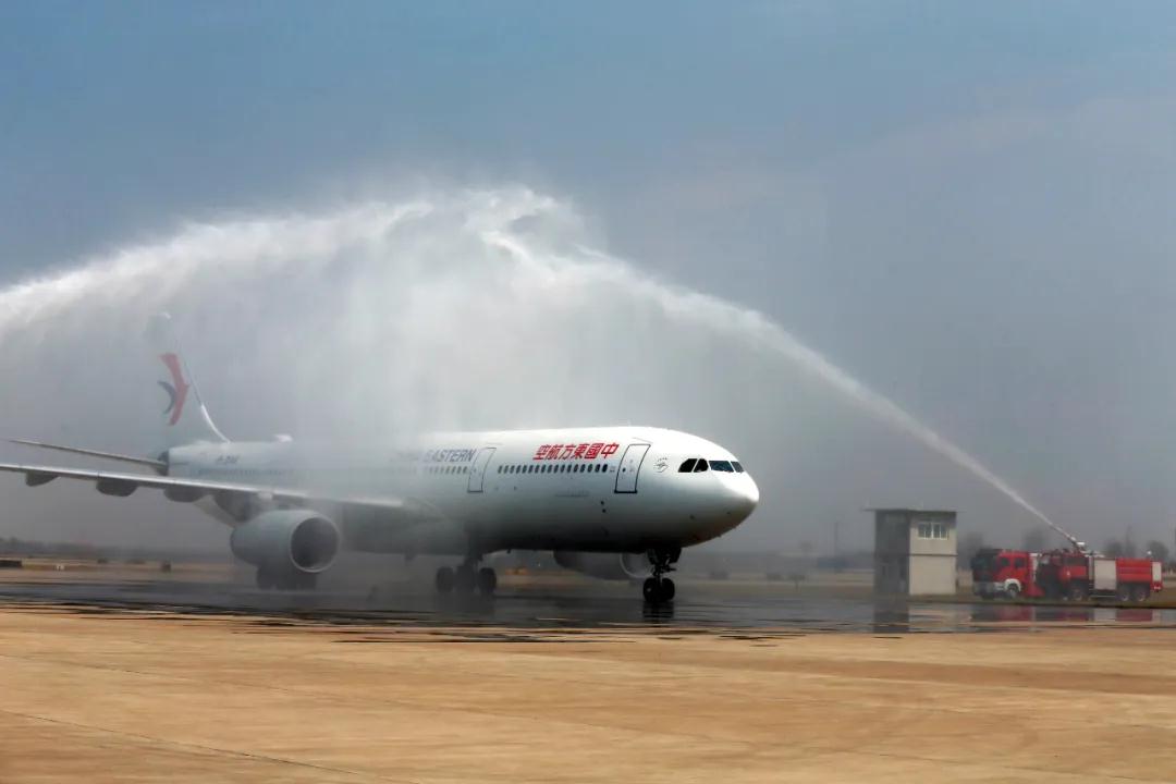 2020年3月24日下午,當兩架滿載 “白衣戰(zhàn)士”的包機降落下來,依次沿著寬闊平坦的跑道滑行時,兩邊早已準備好大功率消防車,轟然噴出兩股清泉似的水柱,形成了一道銀亮亮的“水門”,在滿天晚霞的映照下,如同天空中升起一道美麗的彩虹。