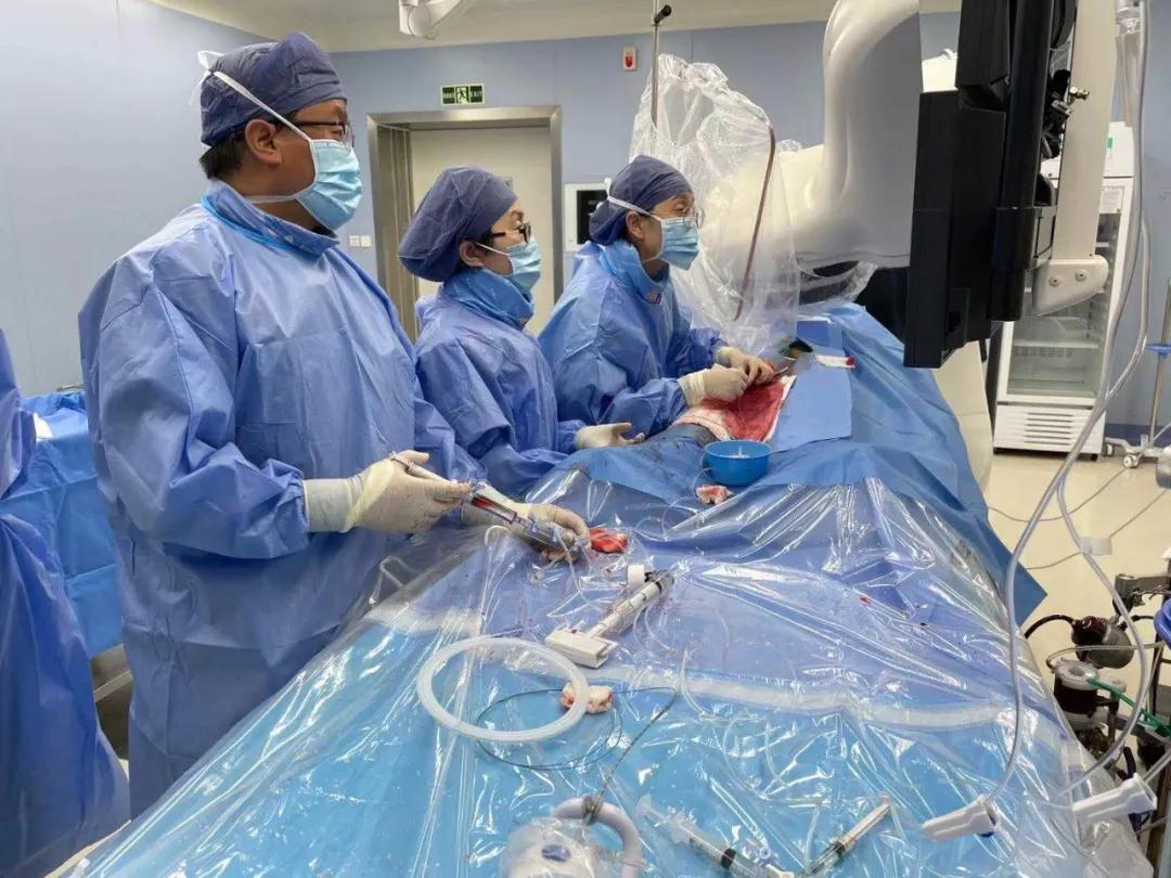 患者已有3枚支架,右冠狀動脈還是完全閉塞的狀態(tài),考慮到手術(shù)風(fēng)險(xiǎn)極大,李偉杰建議在體外膜肺氧合技術(shù)(ECMO)輔助下行支架植入術(shù)。體外膜肺氧合技術(shù)是一種高端的人工心肺替代技術(shù),可以暫時(shí)代替患者的心臟和肺臟進(jìn)行做工,常用于各種危重癥患者。由于手術(shù)難度高,風(fēng)險(xiǎn)大,李偉杰副院長帶領(lǐng)由衛(wèi)錦娟副主任醫(yī)師、郭艷杰副主任醫(yī)師、王長鷹主治醫(yī)師、孫闖主治醫(yī)師組成的心臟內(nèi)科三病區(qū)手術(shù)核心團(tuán)隊(duì)分工合作,在心臟外科二病區(qū)主任程亮團(tuán)隊(duì)的保駕護(hù)航下,手術(shù)最終順利完成,患者平穩(wěn)返回病房,家屬激動不已。第一位患者手術(shù)結(jié)束后,在李偉杰的帶領(lǐng)下,兩支團(tuán)隊(duì)又著手為另一位嚴(yán)重三支病變患者實(shí)施了ECMO輔助下支架植入術(shù),手術(shù)在團(tuán)隊(duì)密切配合下順利完成。