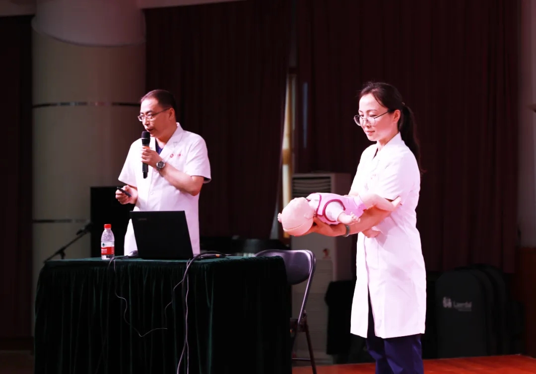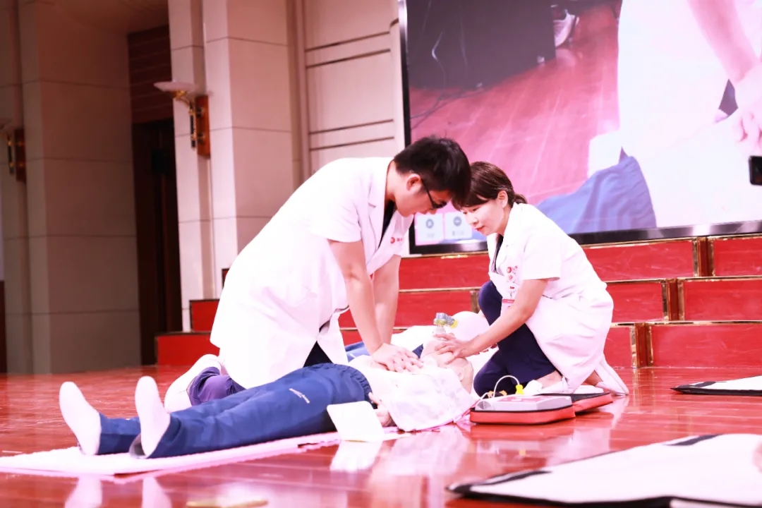 在多功能廳,王彬榮副主任進(jìn)行理論授課;呂玉珠醫(yī)生、張榮榮護(hù)士長(zhǎng)、許哈克分別進(jìn)行了成人、兒童、嬰兒心肺復(fù)蘇術(shù)(CPR)模擬演練、體外自動(dòng)除顫器(AED)的使用、海姆立克法、嬰兒氣道梗阻的緊急處理方法等操作演示,并以互動(dòng)的方式邀請(qǐng)12名學(xué)生代表上臺(tái)進(jìn)行了操作練習(xí),老師們現(xiàn)場(chǎng)進(jìn)行一對(duì)一的指導(dǎo),為大家解答各種疑問(wèn),使他們對(duì)現(xiàn)場(chǎng)心肺復(fù)蘇術(shù)的全過(guò)程有了更加深刻的理解,也使學(xué)生們基本掌握了心肺復(fù)蘇法的操作技能。