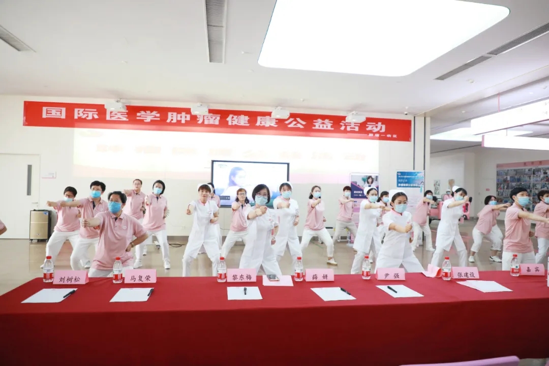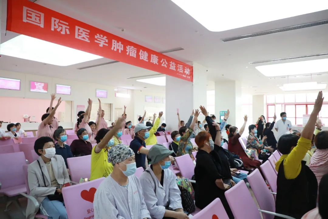 腫瘤一病區(qū)的醫(yī)護(hù)人員和志愿者們共同演練了一段八段錦,隨后的健康知識(shí)問答和歌曲快閃環(huán)節(jié)將活動(dòng)氛圍推向高潮,大家爭(zhēng)先恐后地舉手搶答,現(xiàn)場(chǎng)問答也促進(jìn)了對(duì)于腫瘤防治、康復(fù)知識(shí)的推廣。最后,大家合唱歌曲“相信我們會(huì)創(chuàng)造奇跡”,積極、歡樂的氛圍縈繞不息?;顒?dòng)最后,薛妍副院長(zhǎng)、劉樹松教授和張俊美醫(yī)生對(duì)患者的提問進(jìn)行了耐心、細(xì)致的解答。