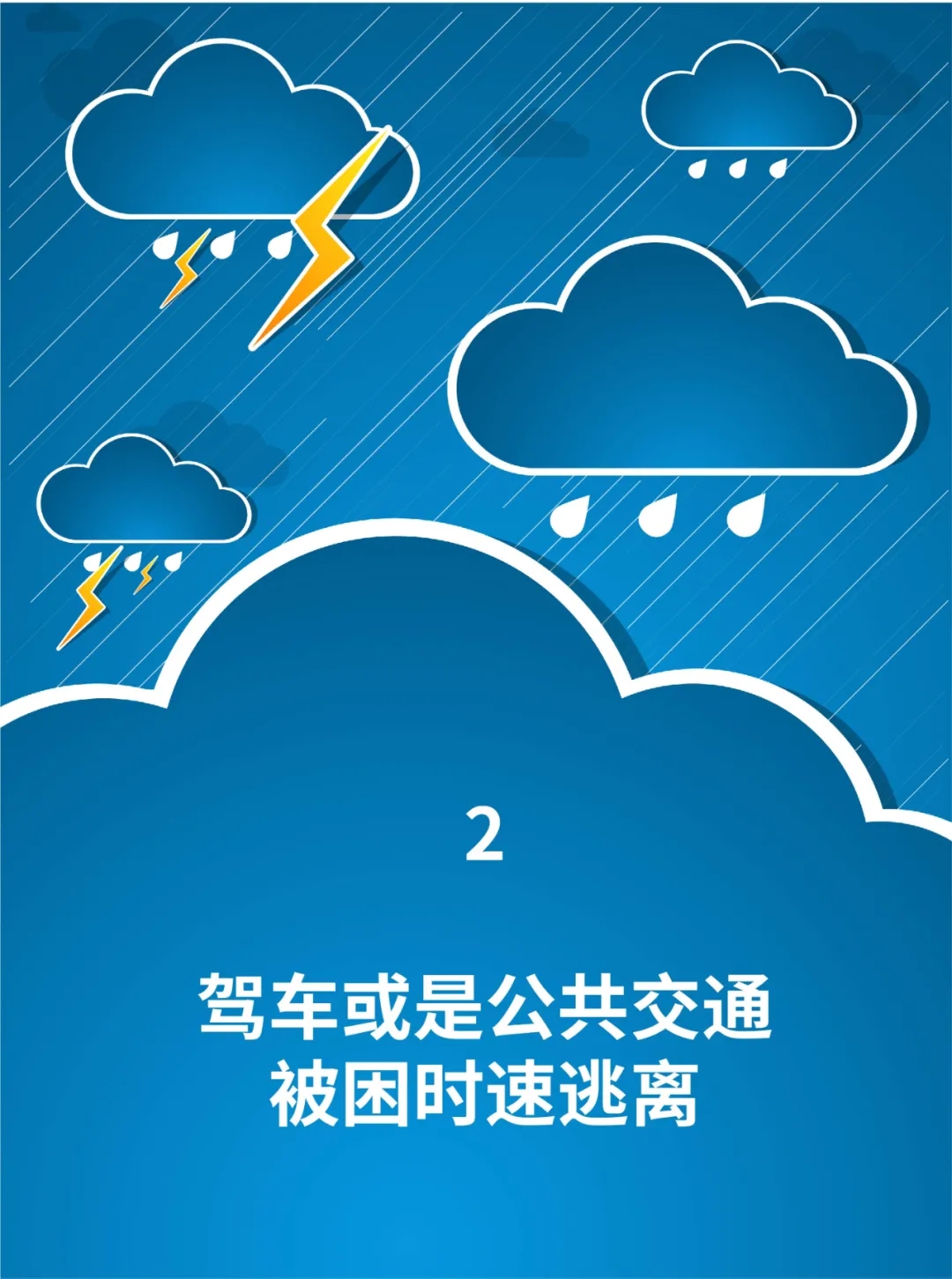 地鐵站、地下停車(chē)場(chǎng)、地下通道、下坡、下沉式立交橋下等低洼地段以及有橋梁、有漩渦的地方很危險(xiǎn)。遠(yuǎn)離老舊建筑、電線(xiàn)桿、廣告牌、路燈。遠(yuǎn)離高壓線(xiàn)、高壓電塔、變電器,電閘、配電箱等電力設(shè)施及有供電危險(xiǎn)標(biāo)志的一切物品。