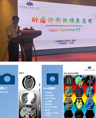 授牌儀式后即開始精彩的學術(shù)講座,首先,山西醫(yī)科大學第一醫(yī)院影像科喬英教授分享了“IQon光譜CT在腫瘤診斷的臨床應(yīng)用”。喬教授指出IQon Spectral CT的光譜重建可以提供多參數(shù)數(shù)據(jù),如單能級圖像、無水碘圖、有效原子序數(shù)值等,更加清晰的觀察病灶范圍,更加精準的發(fā)現(xiàn)小病灶、進行腫瘤分期及術(shù)后療效評估。