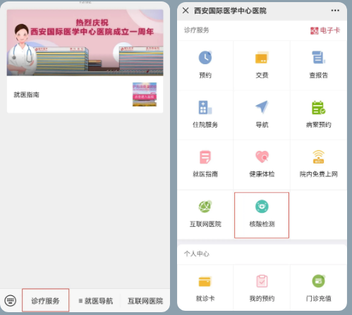 醫(yī)院核酸檢測已開通線上預(yù)約,大家可通過“西安國際醫(yī)學(xué)中心醫(yī)院服務(wù)號”微信公眾號進行預(yù)約。
