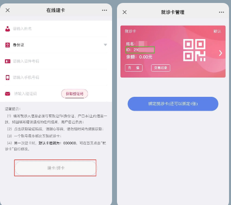 (1)沒有就診卡的人員,請輸入個(gè)人信息完成就診卡綁定。綁卡后,獲得個(gè)人ID號。(如圖所示)
