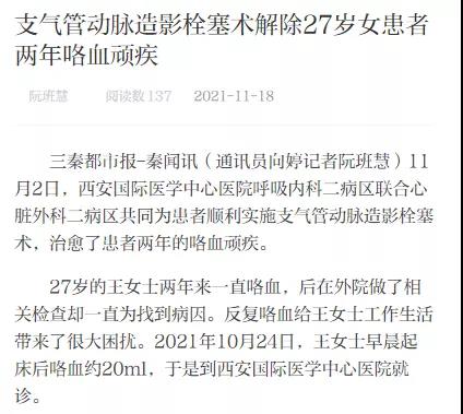 支氣管動(dòng)脈造影栓塞術(shù)解除了27歲女患者兩年頑疾