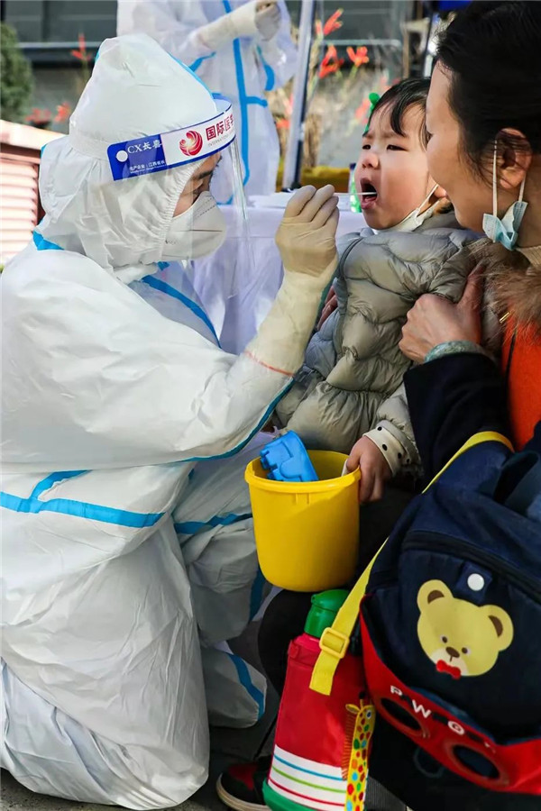 “請(qǐng)您深吸一口氣,屏住呼吸然后迅速摘下口罩,仰頭張大嘴,可能有一點(diǎn)不適,一下就好了。”核酸采樣現(xiàn)場(chǎng),隊(duì)員一遍又一遍地重復(fù)著上述語(yǔ)言,然后迅速用咽拭子為受檢者完成核酸采樣。為了盡快完成采樣工作,隊(duì)員們?cè)谛菹㈤g隙,蹲在地上吃了幾口飯,便迅速投入到工作中。
