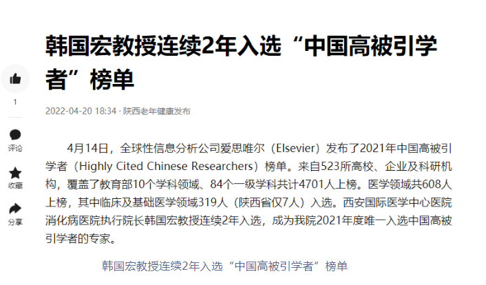陜西老年健康報(bào):韓國(guó)宏教授連續(xù)2年入選“中國(guó)高被引學(xué)者”榜單