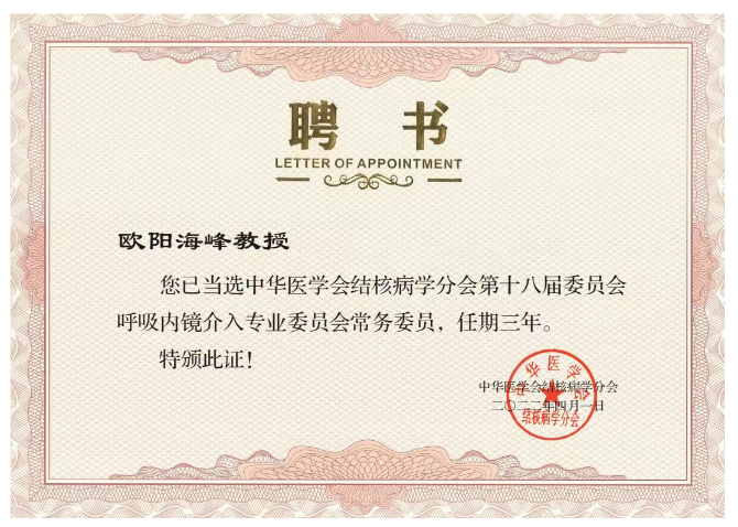 2022年4月,中華醫(yī)學(xué)會結(jié)核病學(xué)分會進(jìn)行換屆工作。西安國際醫(yī)學(xué)中心胸科醫(yī)院歐陽海峰副院長當(dāng)選為“呼吸內(nèi)鏡介入專業(yè)委員會常務(wù)委員”。