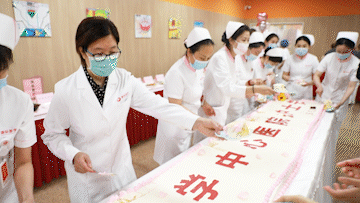 醫(yī)護(hù)餐廳為護(hù)理兄弟姐妹們精心準(zhǔn)備了60*400cm的蛋糕?!白4蠹夜?jié)日快樂!”李武平副院長、張敏主任及各科室護(hù)士長共同切蛋糕送祝福。