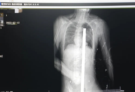 情況緊急!術中探查后發(fā)現(xiàn),長120cm直徑3cm的螺紋鋼經(jīng)患者右側會陰部穿入,傷及直腸,途徑膀胱后方,左側髂總動靜脈之間傷及左腎后,經(jīng)胰腺后方在肝脾之間穿破膈肌,在下肺靜脈前方穿入左肺穿破氣管及左右主支氣管膜部,止于主動脈弓下水平,穿入體內(nèi)的部分達到75cm。