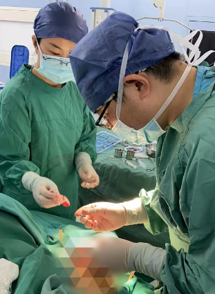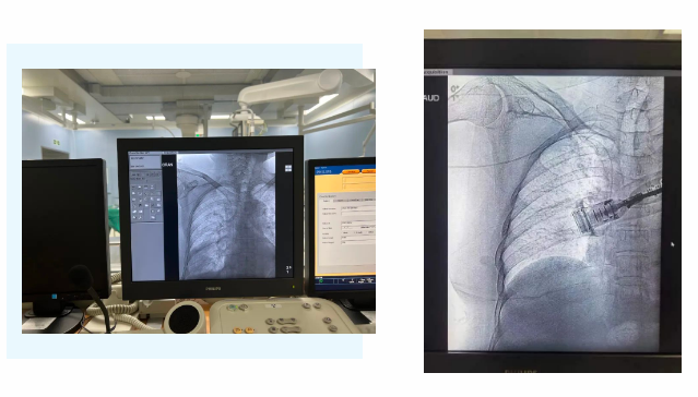 在麻醉手術(shù)中心的配合下,手術(shù)首先由韓海靜護士長在超聲引導下應(yīng)用“塞丁格”法穿刺將針尖一樣細的導絲送入血管,術(shù)中在DSA透視下將導管沿著血管送達上腔靜脈,尖端精準定位至上腔靜脈開口處。隨后,胸腔外科支亞男主治醫(yī)師在穿刺點下方取2厘米小切口內(nèi)進行上臂港囊袋和隧道的制作及導管與港座連接,最后進行港體埋植及皮內(nèi)縫合,使患者切口隱蔽美觀創(chuàng)傷小,術(shù)中出血量極少。手術(shù)在X片影像留影,最終手術(shù)順利完成。