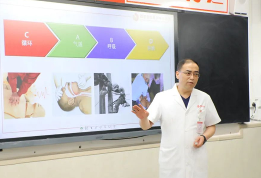 西安國際醫(yī)學中心醫(yī)院麻醉手術(shù)中心副主任王彬榮以“基礎(chǔ)生命支持”為主題,給老師們詳細介紹了現(xiàn)場急救、復蘇的定義和基本流程,并進行現(xiàn)場演示。