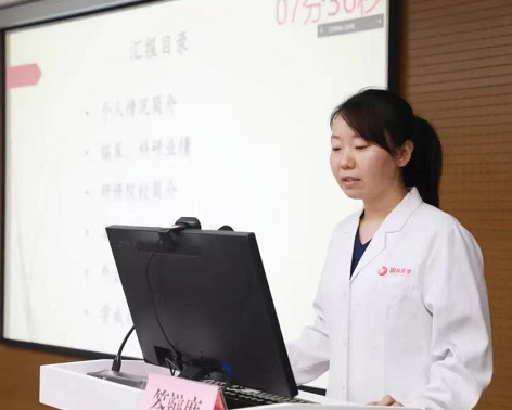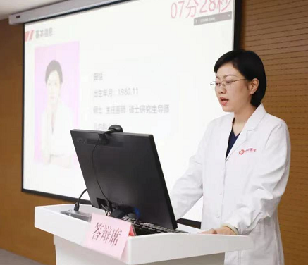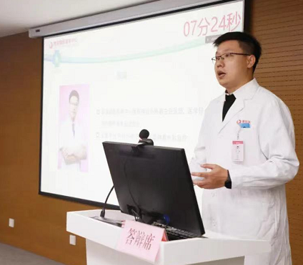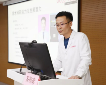 經(jīng)過前期籌備、選拔、評審,共有9名申請人進入答辯環(huán)節(jié)。按照研修人員遴選流程,呼吸與危重癥醫(yī)學(xué)科歐陽海峰、胸腔外科王武平、心臟內(nèi)科李煒、神經(jīng)外科鄭濤、生殖內(nèi)分泌科丁旭、心身醫(yī)學(xué)科鄒學(xué)、檢驗中心田江紅、醫(yī)學(xué)美容中心王延婷、北院區(qū)兒科田恬依次就學(xué)歷背景、科研進展、國際交流合作經(jīng)歷、出國研究意向等方面進行了英文展示與匯報。