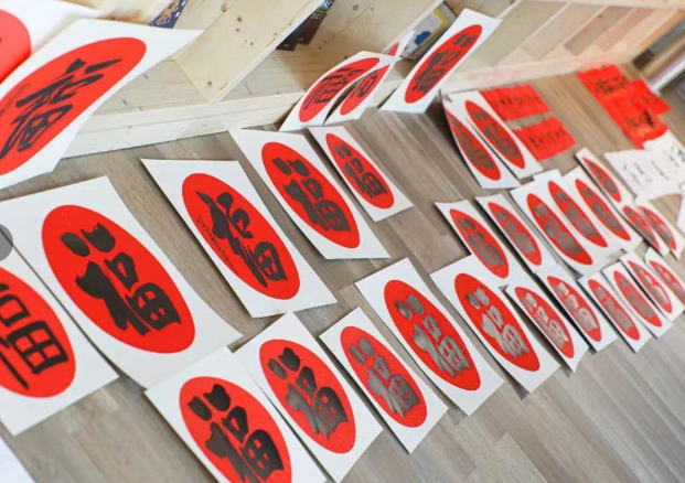 “厚德載物”、“寧靜致遠(yuǎn)”、“天高海闊”......一張張燙金的紅紙散發(fā)著墨香,一個個“?!弊衷诳w、行書、草書間自由切換,書法蒼勁有力、磅礴大氣,在紅色的襯托下更顯喜慶祥和。