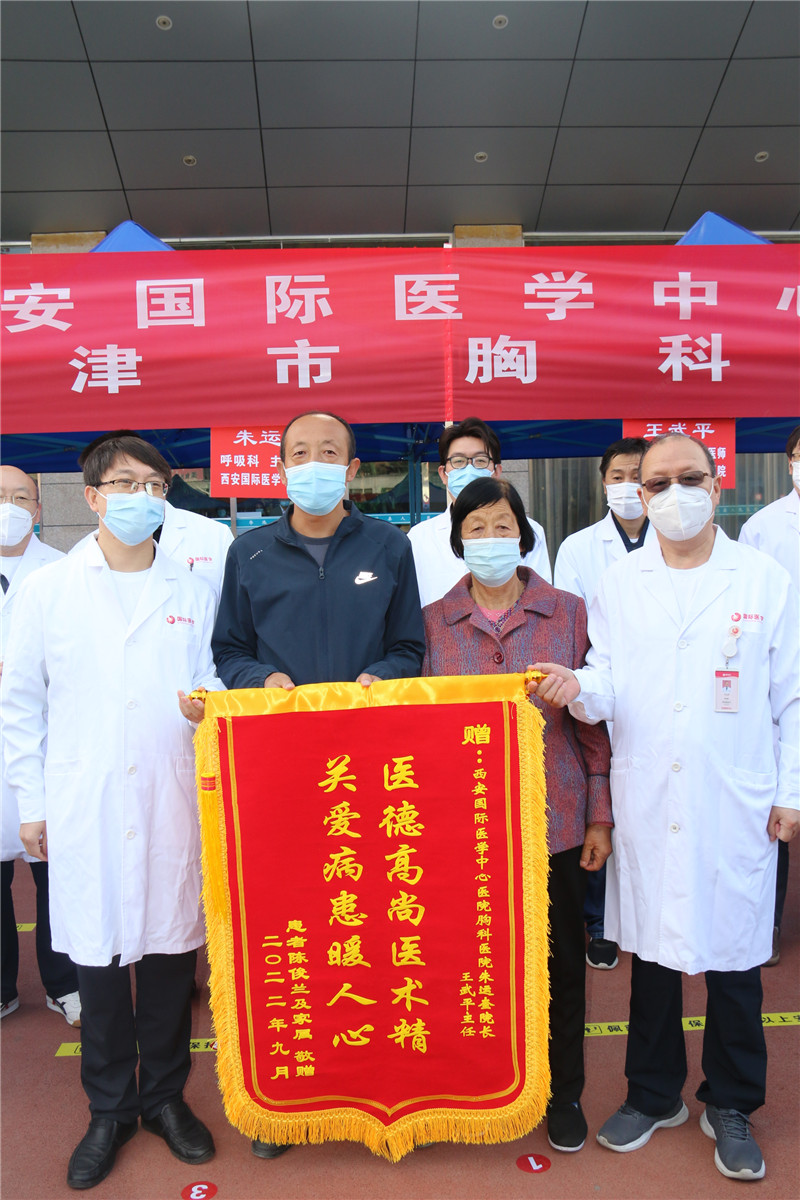 “朱院長、王主任,出院的時候我走的匆忙,沒好好謝謝你們,今天無論如何都要補上?!崩详愃蜕蟿倓傏s制好的錦旗,連聲道謝。
