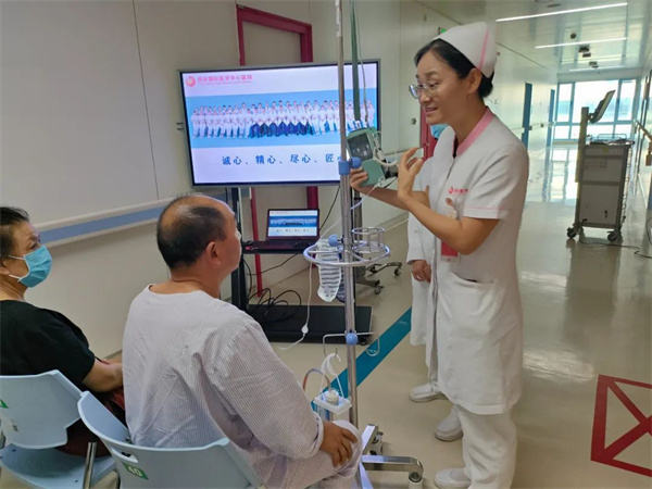 為了鞏固學(xué)習(xí)效果,胸腔外一科護(hù)士長(zhǎng)李進(jìn)與患者進(jìn)行了互動(dòng)問答,并再次耐心復(fù)述了可控式鎮(zhèn)痛泵的使用方法以及管路自我防護(hù)的要點(diǎn)。