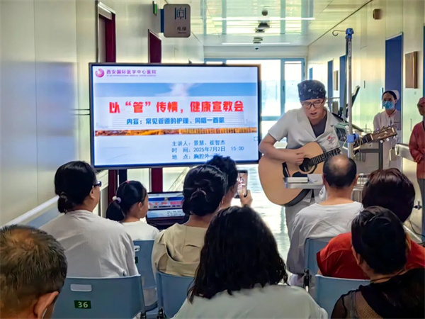 宣教會(huì)現(xiàn)場(chǎng)還充滿了溫暖的音符。崔智杰護(hù)士巧妙地將音樂療愈融入護(hù)理關(guān)懷,為在場(chǎng)患者深情彈唱了《隱形的翅膀》和《月亮代表我的心》。他表示:“醫(yī)護(hù)人員和家屬的心愿是一樣的,都期盼患者早日康復(fù)。希望音樂的感染力能為他們?cè)鎏響?zhàn)勝病魔的力量?!备杪暡粌H傳遞了關(guān)懷,也進(jìn)一步拉近了護(hù)患距離,增強(qiáng)了患者積極面對(duì)疾病的心理建設(shè)。