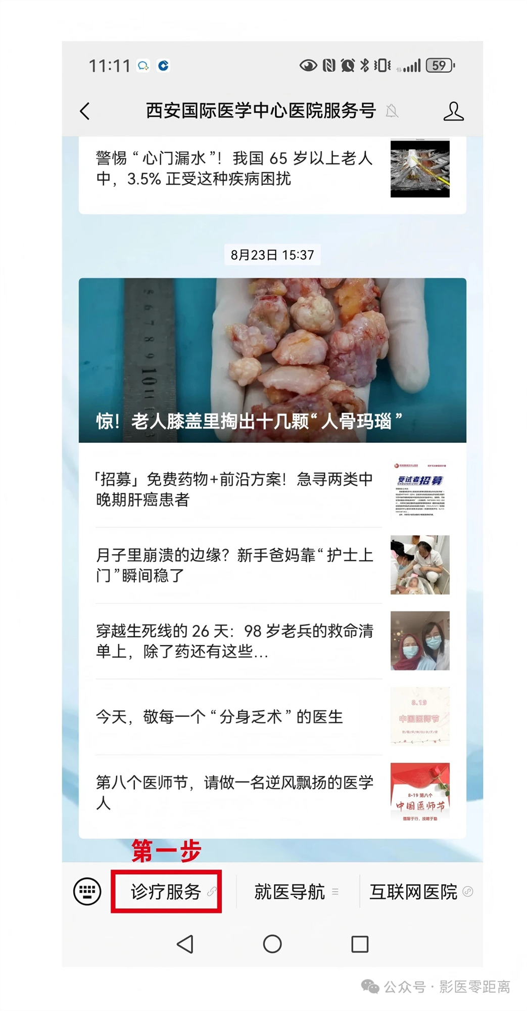 第一步:在醫(yī)院微信公眾號首頁,點擊底部菜單欄左側(cè)的【診療服務(wù)】入口