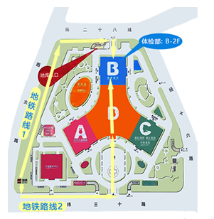 D口向南50米→左拐向東400米進入北院區(qū)→進入急診大廳→直行到達B樓(藍色樓) →乘扶梯至二樓→到達體檢部